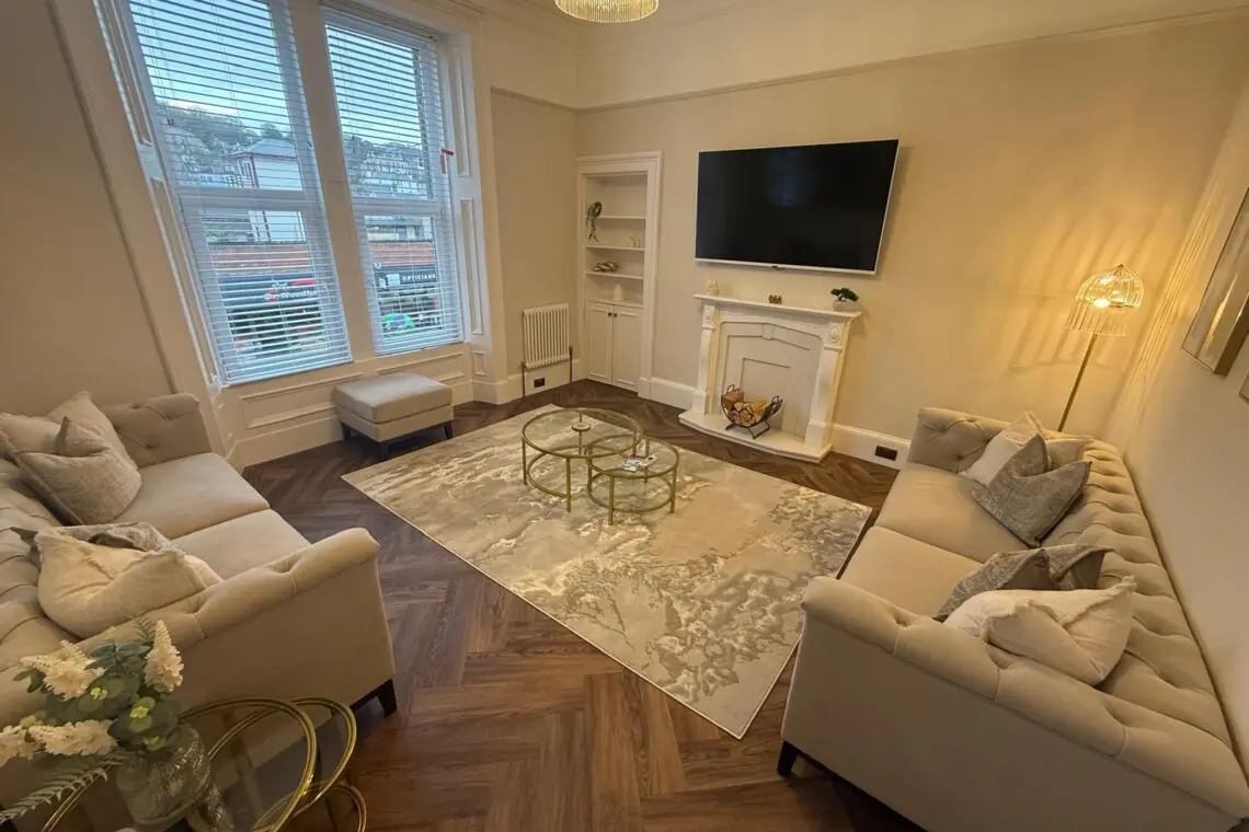 This beautifully appointed apartment offers three luxurious Super king-sized beds, each equipped with plush, high-quality super king pillows to ensure a restful and comfortable night’s sleep. The interior features two contemporary-designed bathrooms, both elegantly finished to provide a spa-like experience. One bathroom includes a spacious free-standing bath perfect for relaxing after a long day, while the other offers a modern walk-in shower for quick and convenient refreshment. The stylish decor and thoughtful layout create a welcoming atmosphere, making it ideal for both leisure and business travellers seeking comfort and convenience.